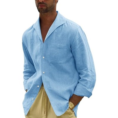 Mens Summer Casual Button Down Shirt Long Sleeve Lapel Collar Solid Color Shirts Fashion Holiday Beach Tops